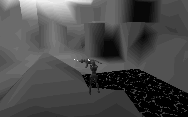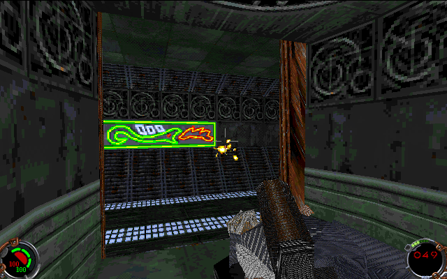 It is a lot worse while moving; textures aligned at angles like that to the camera are very floaty. It can get worse. In Jedi Knight the textures of weapons, characters, and pillars are warping all over the objects; they are simply not mapped correctly at all.
