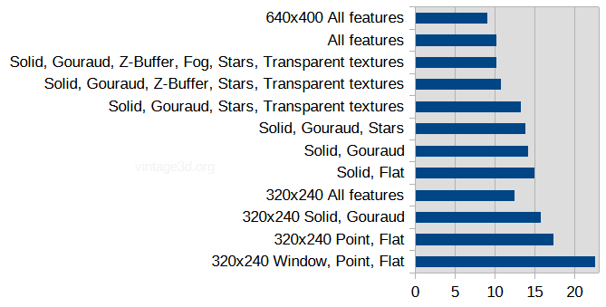 The maximum framerate occurred while rendering in a window. There is a drop of ~10 % when we start actually outputting pixels, and again when the resolution is increased to 512x384. No feature is extraordinarily taxing; the most costly is depth buffering. Increasing the resolution further to 640x400 causes only 10 % slowdown.